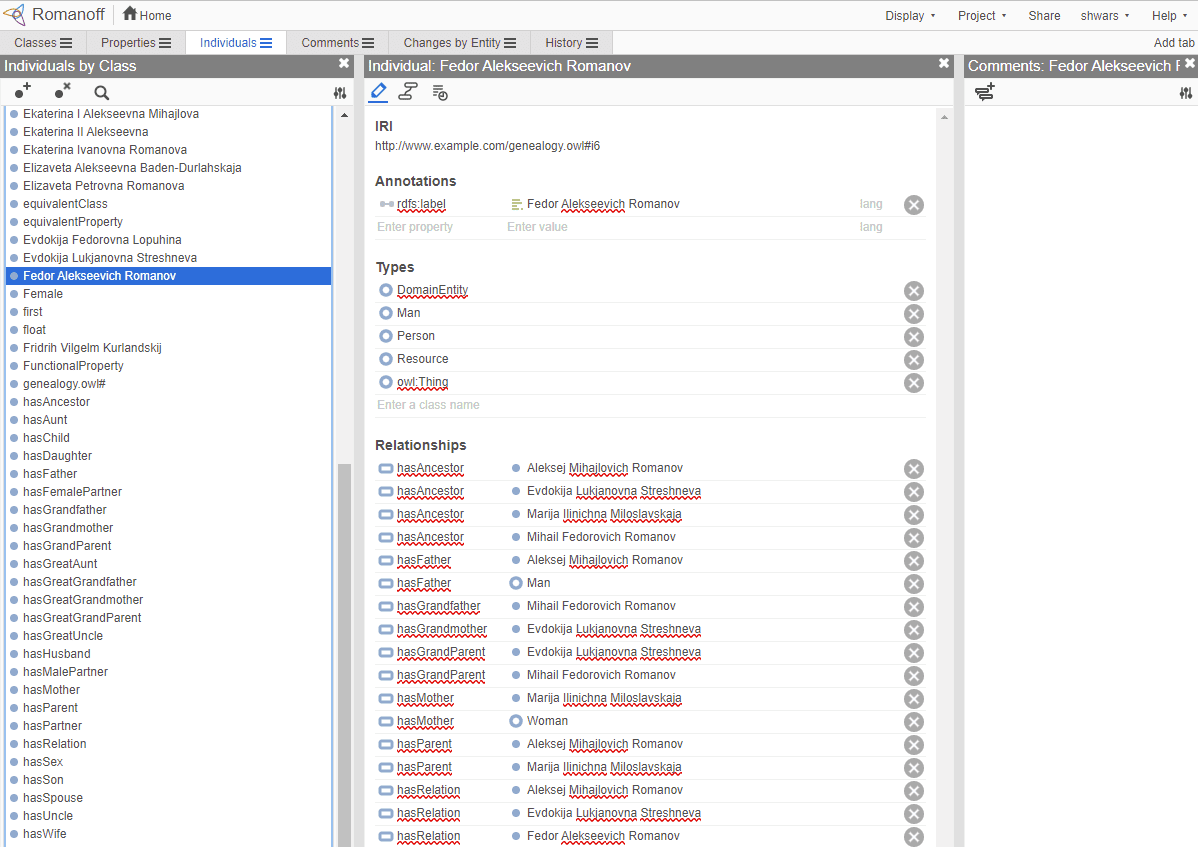 Web Protégé editor open with the Romanov Family ontology. Screenshot by Dmitry Soshnikov