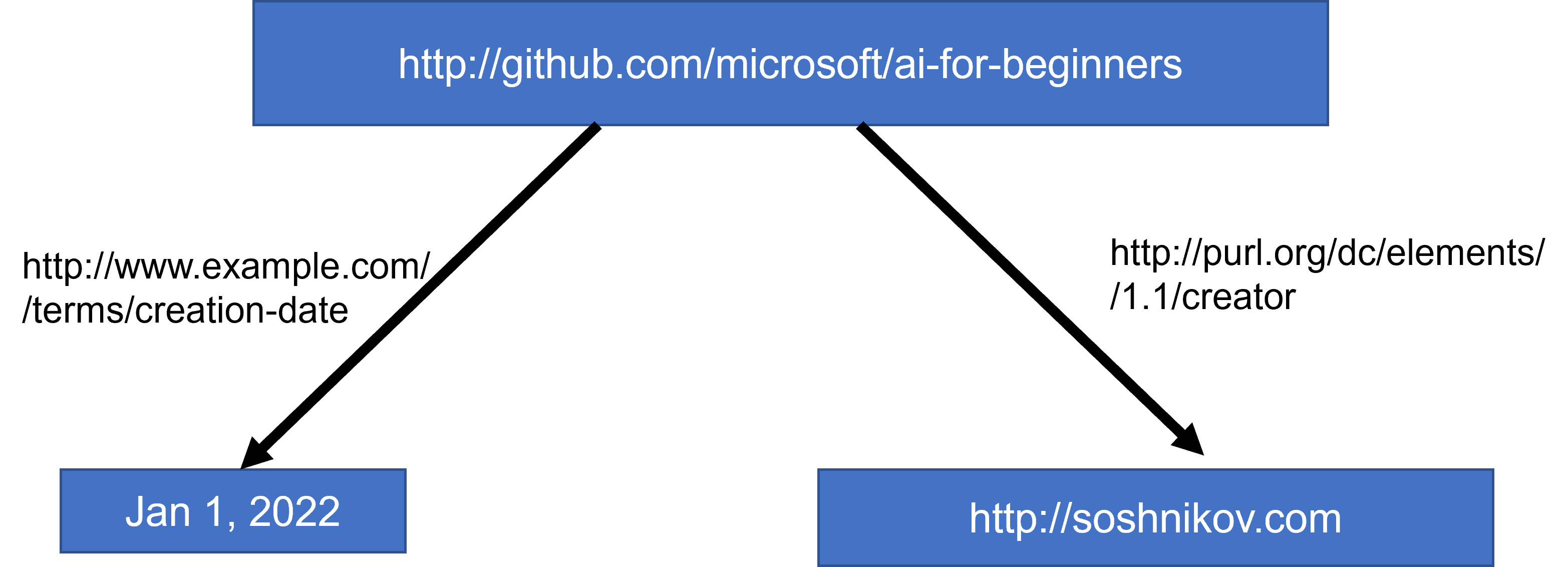 In the semantic web, all representations are based on triplets. Each object and each relation are uniquely identified by the URI. For example, if we want to state the fact that this AI Curriculum has been developed by Dmitry Soshnikov on Jan 1st, 2022 - here are the triplets we can use: