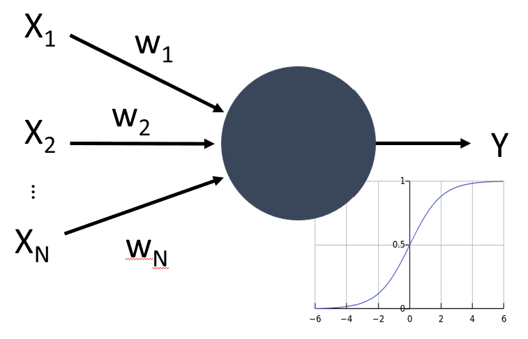 Thus, the simplest mathematical model of a neuron contains several inputs X1, …, XN and an output Y, and a series of weights W1, …, WN. An output is calculated as: