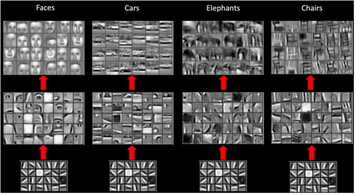- We can use the same approach to find patterns in high-level features, not only in the original image. Thus CNN feature extraction work on a hierarchy of features, starting from low-level pixel combinations, up to higher level combination of picture parts.