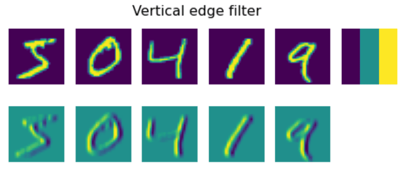 For example, if we apply 3x3 vertical edge and horizontal edge filters to the MNIST digits, we can get highlights (e.g. high values) where there are vertical and horizontal edges in our original image. Thus those two filters can be used to “look for” edges. Similarly, we can design different filters to look for other low-level patterns:
