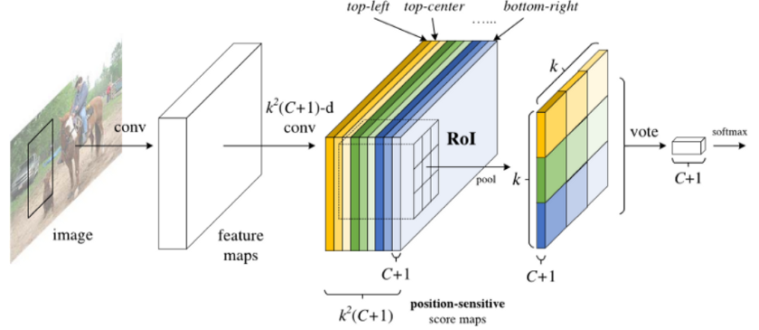 - Features are processed by Position-Sensitive Score Map. Each object from $C$ classes is divided by $k\times k$ regions, and we are training to predict parts of objects.