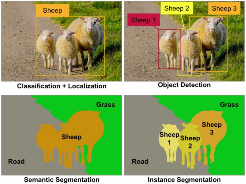 For instance segmentation, these sheep are different objects, but for semantic segmentation all sheep are represented by one class.
